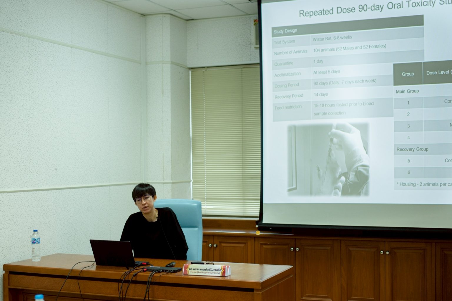 ดร. ภัสสราภรณ์ ศรีมังกรแก้ว ผู้ช่วยวิจัย (ผู้ชำนาญการพิเศษ) และ นางสาวนันทนา เอมเทศ นักวิชาการพัฒนาคุณภาพ ผู้เชี่ยวชาญจาก ศูนย์สัตว์ทดลองแห่งชาติ มหาวิทยาลัยมหิดล ได้รับเชิญจาก ศูนย์สัตว์ทดลอง สำนักวิจัย สถาบันวิจัยจุฬาภรณ์ มาเป็นวิทยากรบรรยายและให้คำปรึกษาในการสัมมนาหัวข้อเกี่ยวกับการทดสอบความเป็นพิษตามหลักการมาตรฐานสากล ณ ห้องประชุม R607 ชั้น 6 อาคารอเนกประสงค์ สถาบันวิจัยจุฬาภรณ์ การสัมมนาครั้งนี้มีวัตถุประสงค์เพื่อ สนับสนุนการเตรียมความพร้อม ของศูนย์สัตว์ทดลอง สถาบันวิจัยจุฬาภรณ์ สำหรับการขยายขอบเขตและวิธีการทดสอบความเป็นพิษกึ่งเรื้อรังทางปาก (Subchronic oral toxicity) ตามหลัก OECD GLP รวมถึงการศึกษาแบบหลายสถาบัน (Multi-site study) ตามหลักการ OECD GLP ให้แก่ผู้ปฏิบัติงาน