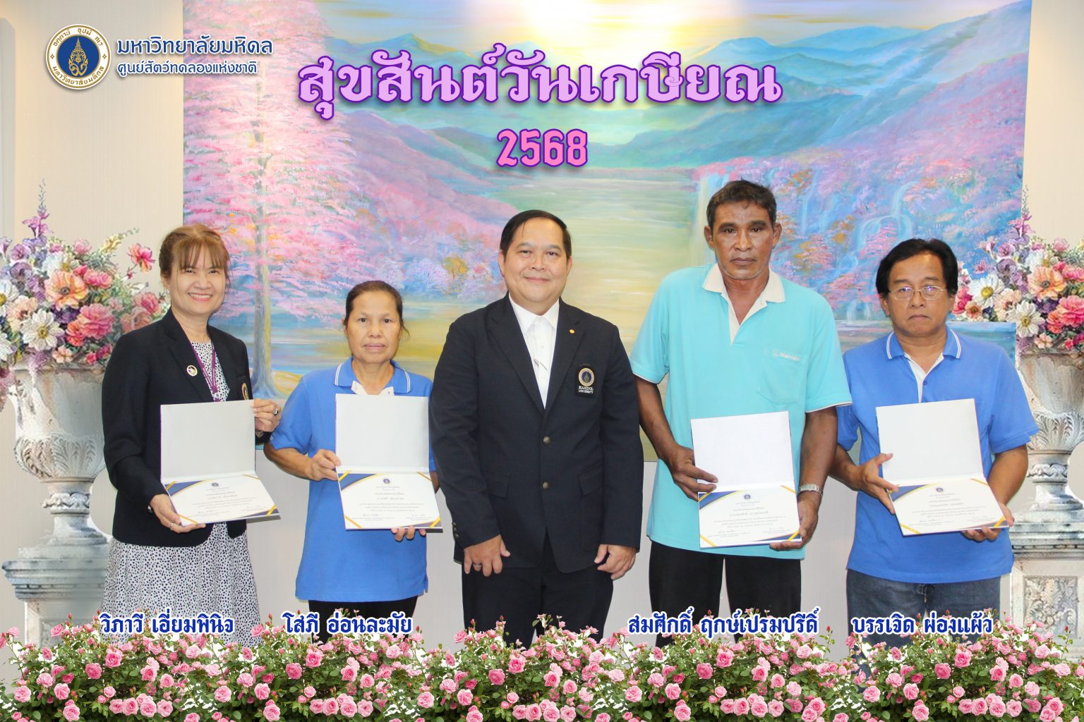 เนื่องในโอกาสครบวาระเกษียณอายุราชการของบุคลากรศูนย์สัตว์ทดลองแห่งชาติ มหาวิทยาลัยมหิดล 30 กันยายน 2568 นายสัตวแพทย์สุรชัย จันทร์ทิพย์ ผู้อำนวยการศูนย์ฯ มอบใบประกาศเกียรติคุณ และขอบคุณบุคลากรที่เกษียณอายุราชการ ที่ปฏิบัติงาน ทำคุณประโยชน์ สร้างชื่อเสียงให้กับศูนย์ฯ มาโดยตลอดจนครบวาระเกษียณอายุราชการ โดยในปี 2568 นี้ มีจำนวน 4 ท่าน ได้แก่ นางวิภาวี เอี่ยมพินิจ นางโสภี อ่อนละมัย นายสมศักดิ์ ฤกษ์เปรมปรีดิ์